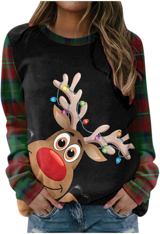 Christmas Women'S round Neck Long Sleeve Sweatshirt Plaid Print Cute Elk Casual Loose Blouse Pullover Tops Brown