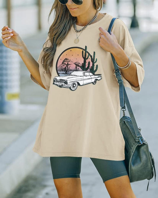 Oversized Shirt for Women Vintage Graphic Tee Loose Western Cactus Tops Beige L